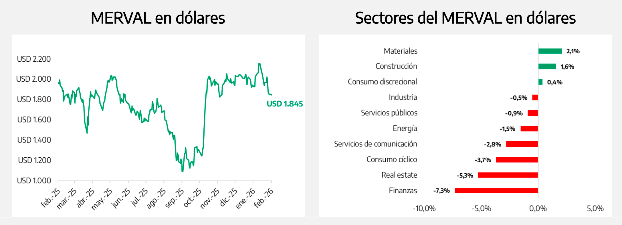Desglosando el índice, el sector financiero fue el más castigado (-7,3% en dólares). Por su parte, las compañías pertenecientes al segmento de materiales fueron las más defensivas y treparon 2,1% en la semana en USD.